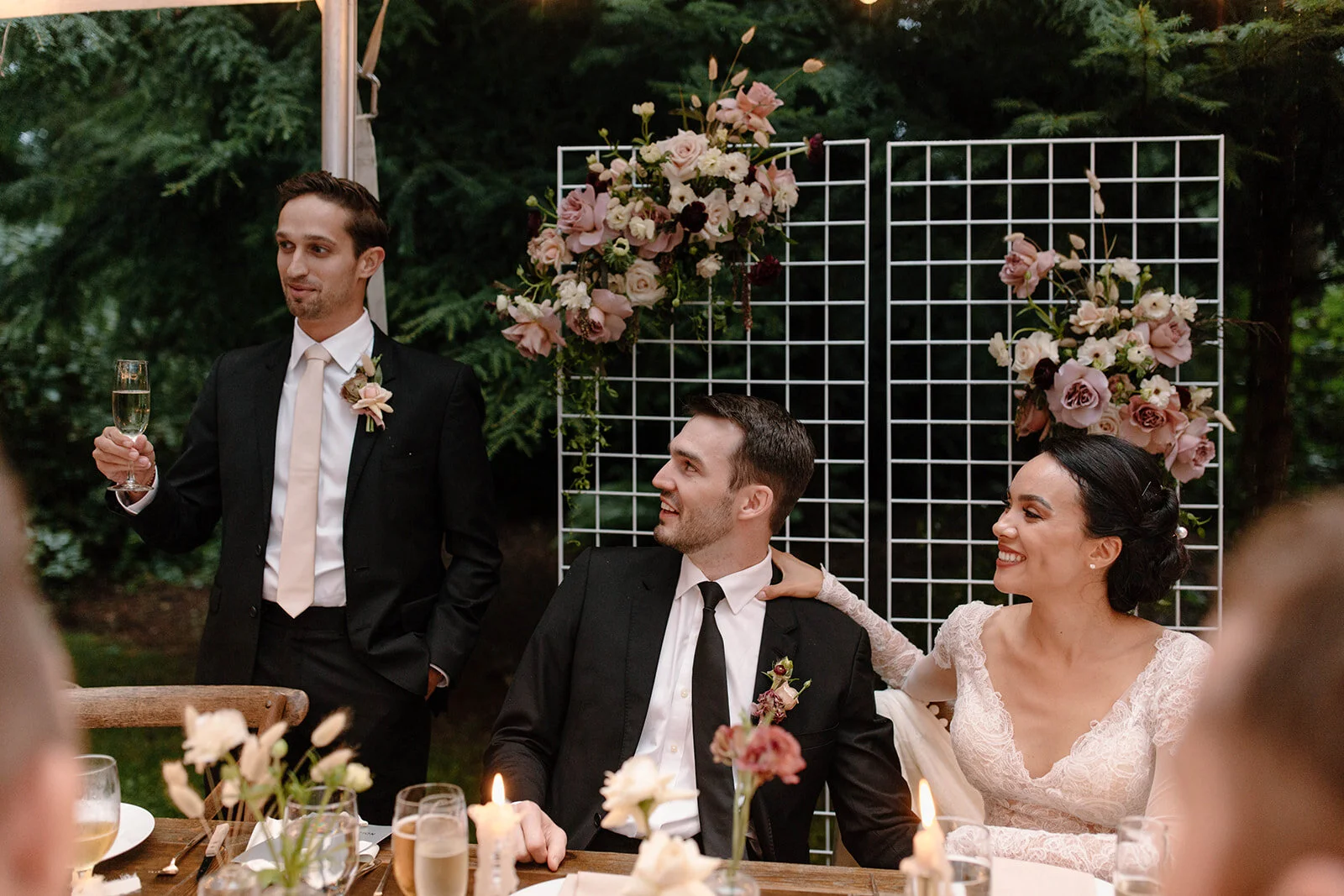This backyard Covid micro wedding was one of my favorite weddings of 2020. It was dreary and misting and so Seattle weather. The family built out the backyard with a tent, dance floor, and a stunning ceremony space right under the giant tree in the middle of the yard. My first tree installation ever. It was definitely a challenge but I am so happy with how it all turned out.